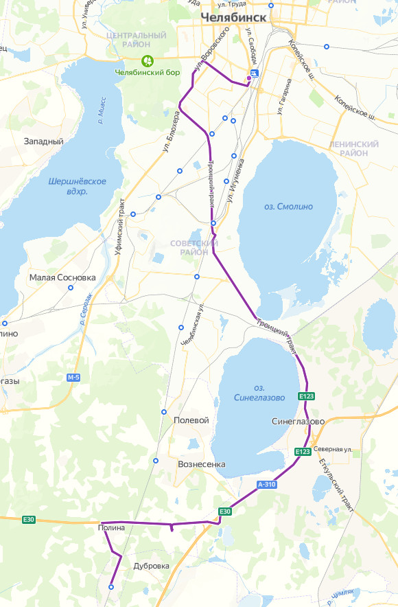 ЧЕЛЯБИНСК, Теплотехнический институт → ул. Российская → Юридический институт → Юрюзань → ул. Танкистов → Сад Тракторосад 2 → Сад Тракторосад 1 → Центральная усадьба → Сад Дружба → Сад Учитель → поворот на Аэропорт → Сад Лесная Поляна, ост. 1 → Сад Лесная Поляна, ост. 2 → Сад Лесная Поляна → САД ТЕПЛОСТРОЕВЕЦ