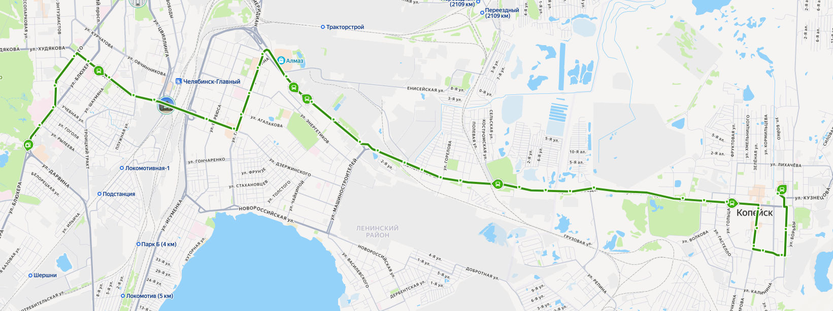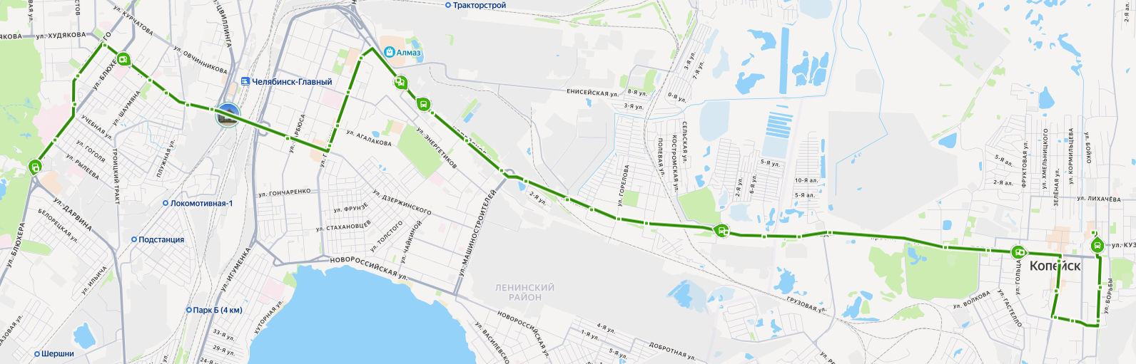 КОПЕЙСК, Автовокзал → площадь Красных Партизан → Завод Кирова → проспект Ильича → ДК Кирова → ТК Слава → Магазин Книжный мир → проспект Победы → ул. Хохрякова → Завод пластмасс → Огородная → ТЦ Метро → Рыбокомбинат → пос. Мясокомбинат → ЧКПЗ → ул. Горелова → Обуховская улица → Гаражи → Сад Энергосад-1 → Механический завод → ТЭЦ-1 → Завод ЖБИ-2 → Енисейская улица → Технический колледж → ул. Руставели → Дом обуви → ТРК Аврора → ул. Барбюса → Завод Колющенко → Магазин Губернский → ДК Колющенко → Дорожная больница → ул. Доватора → Медицинский университет → Областная больница → ул. Рылеева → ЧЕЛЯБИНСК, ТК Кольцо