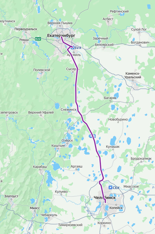ЧЕЛЯБИНСК, Центральный автовокзал → Автостанция Северные ворота → поворот на Урефты → дер. Султаева → поворот на Чишму → поворот на Смольное → поворот на Янги-Юл → поворот на Большое Таскино → поворот на Кунашак → поворот на дер. Ибрагимова → поворот на Карагайкуль → поворот на Большой Куяш → поворот на Малый Куяш → Караболка → Аллаки → поворот на Тюбук → поворот на Снежинск → поворот на Знаменку → поворот на Клеопино → поворот на Щербаковку → поворот на Черкаскуль → Кафе Автоланч → поворот на дер. Космакова → поворот на Октябрьский → Аэропорт Кольцово → ЕКАТЕРИНБУРГ, Северный автовокзал