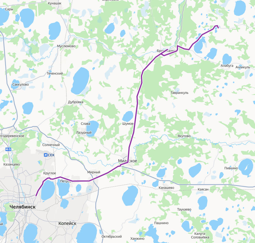 ТЕРЕНКУЛЬ, Школьная улица → Тирикуль → Бродокалмак, ул. Усадьбы Совхоза → Бродокалмак → ул. Усадьбы Совхоза → поворот на Боровое → Шибаново → поворот на Шумово → Миасское, ул. Дружбы → Пожарная часть → Центр → Миасское, Автостанция → Шахта 17 → Вахрушево → поворот на Озерный → Петровский → 1-ый переезд → ул. Танкистов → ЧЕЛЯБИНСК, Автостанция Восточные ворота