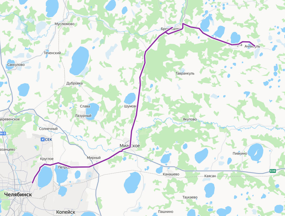 АЧЛИКУЛЬ, Церковь Спаса Преображения → Алабуга, Школа → Алабуга → Кадкуль → ул. Усадьбы Совхоза → БРОДОКАЛМАК → ул. Усадьбы Совхоза → поворот на Боровое → Шибаново → поворот на Шумово → Миасское, ул. Дружбы → Пожарная часть → Центр → МИАССКОЕ, Автостанция → Шахта 17 → Вахрушево → поворот на Озерный → Петровский → 1-ый переезд → ул. Танкистов → ЧЕЛЯБИНСК, Автостанция Восточные ворота