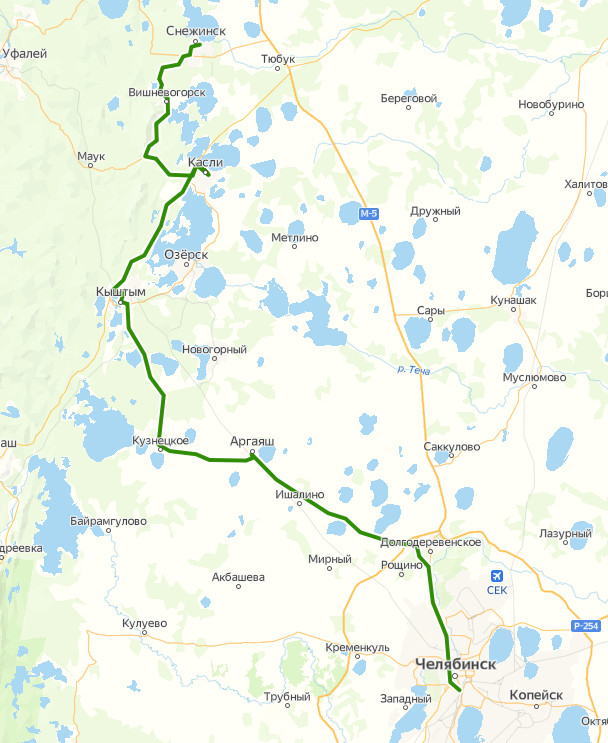 СНЕЖИНСК, Автовокзал → КПП-5 → КПП-5 → Вишневогорск, Кондитерская фабрика → ВИШНЕВОГОРСК, Автостанция → ДК Горняк → Центр детского творчества → ГОК-1 → переулок Ленина → АТП → Партизанская улица → Вишневогорск, Высокогорная улица → СНТ Светленький → СНТ Юбилейный → Вишневогорский мост → КАСЛИ, Автовокзал → Вишневогорский мост → КЫШТЫМ, Автовокзал → Каолиновый → поворот на Бижеляк → Кузнецкое → поворот на Передовик → поворот на Сыргайды → Кладбище → АРГАЯШ, Автовокзал → дер. Бажикаева → Птицефабрика → Ишалино → поворот на озеро Кумкуль → Касарги → поворот на Ключевку → Новое Поле → Казанцево → поворот ЧМК → ЧЕЛЯБИНСК, Центральный автовокзал