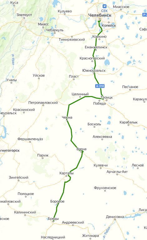 ЧЕЛЯБИНСК, Центральный автовокзал → Автостанция Южные ворота → поворот на Дубровку → Сары → Еманжелинка, ост. 1 → Еманжелинка, ост. 2 → поворот на Еманжелинск → Борисовка → Станция Таянды → Ключи → поворот на Красногорский → поворот на станцию Красноселка → Нагорный → Кичигино → ул. Заводская → Южноуральск, пос. Плановый → Половинка → Карсы → поворот на Ясные Поляны → Нижняя Санарка → поворот на Осиповку → поворот на Целинный → поворот на Каменку → поворот на Подгорное → поворот на Безводный → Тарасовка → поворот на Чесму → Бородиновка → Варна, Кафе → поворот на Красноармейский → поворот на Новониколаевку → поворот на Мичуринский → Карталы → поворот на Вишневый → поворот на Елизаветопольское → поворот на Гогино → поворот на Боровое → Бреды → Бреды, Автостанция → БРЕДЫ, Железнодорожный вокзал
