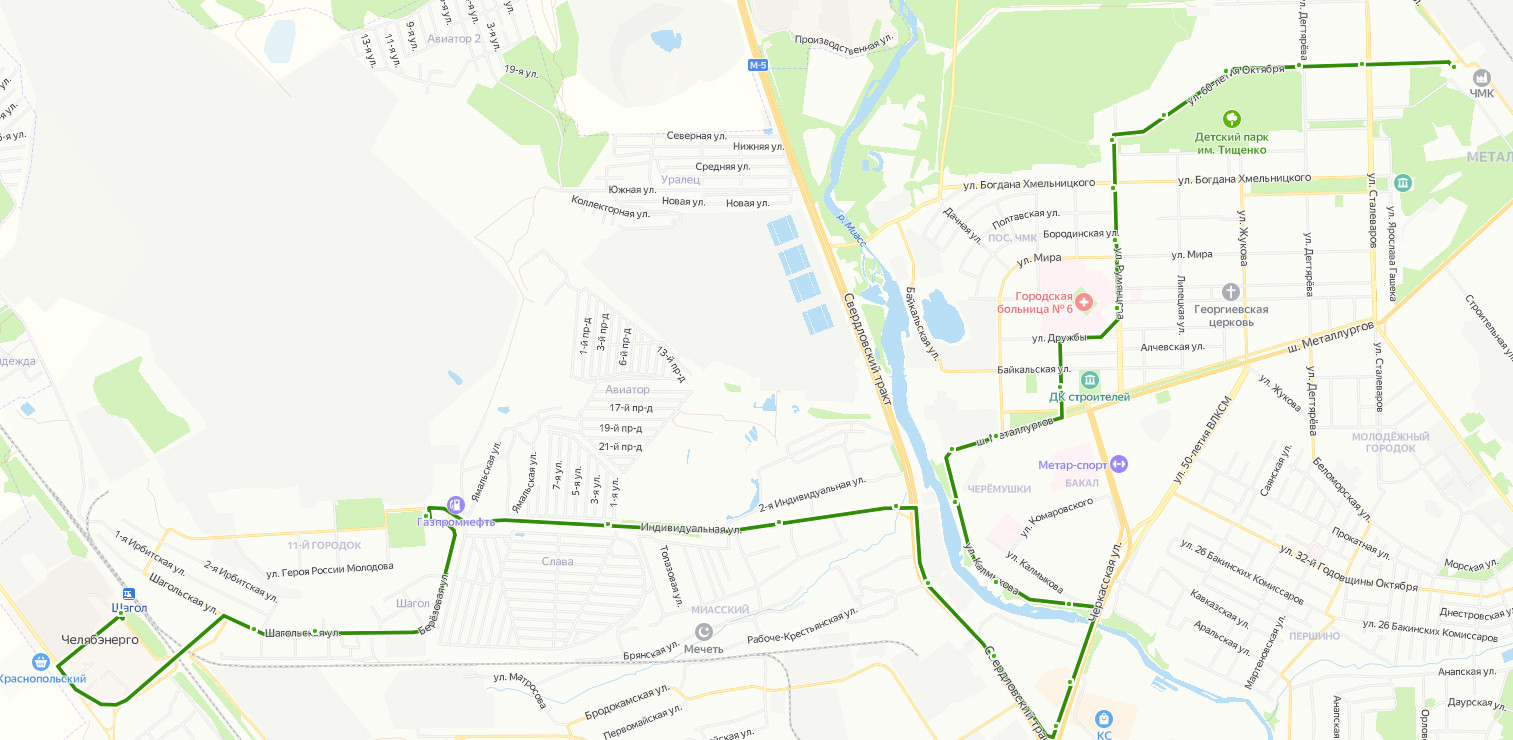 ЧМК → ДК Восток → Сквер Победы → Администрация → Парк Тищенко → Общежитие → ул. Богдана Хмельницкого → ул. Мира → Больница ЧМК → ул. Обухова → Школа 94 → ш. Металлургов → Набережная → Почта → ул. Пети Калмыкова → ТК Северный → ул. Черкасская → ТК Орбита → Мельзавод Победа → поворот на ЧВВАКУШ → пос. Миасский → Сад Авиатор → ЧВВАКУШ → ул. Шагольская → Магазин → пос. ЧЕЛЯБЭНЕРГО