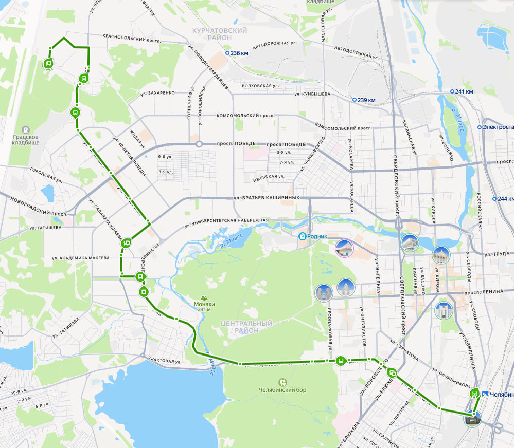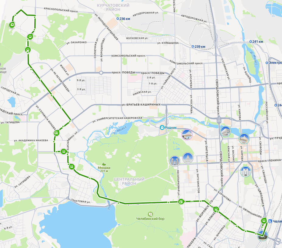 АВТОВОКЗАЛ ЦЕНТРАЛЬНЫЙ → Пригородные кассы → Магазин Губернский → ДК Колющенко → Дорожная больница → ул. Доватора → ул. Худякова → ТК Калибр → ОСШ по футболу → Детский комплекс → Пляж Городской → пос. Благодатово → ул. Сахарова → РМК-Арена → ул. Королева → ул. Макеева → ул. Юлаева → 25 микрорайон → ул. 250-летия Челябинска → ул. Чичерина → 18 микрорайон → ЖК Александровский → ул. Бейвеля → ул. Юсупова → 55 микрорайон → Парковый микрорайон → ул. БРУСИЛОВА