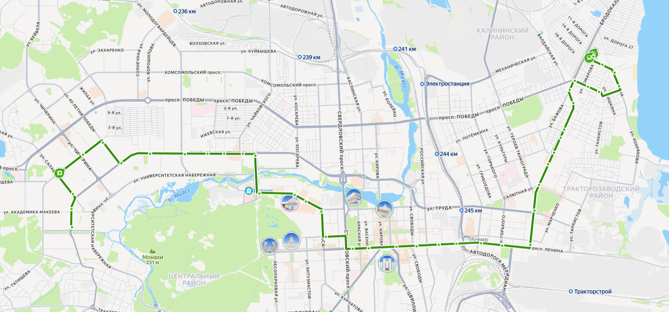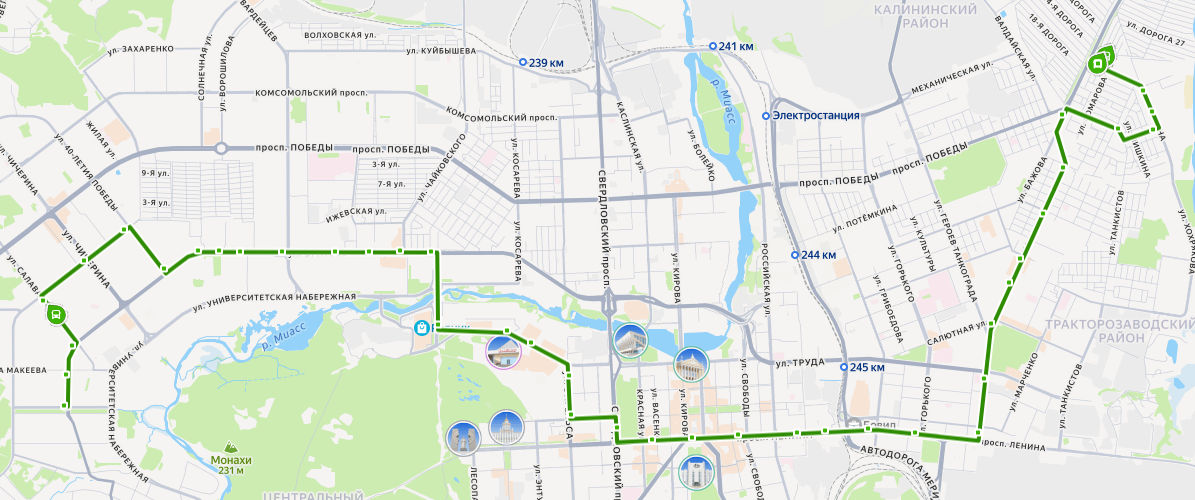 ул. МАМИНА → Пляж Первоозёрный → Первое озеро → Школа 19 → пос. Первоозёрный → ул. Танкистов → ул. Завалишина → ул. Октябрьская → Магазин Шатура → ДК Ровесник → Сад Победы → ул. 1 Пятилетки → Театр ЧТЗ → пл. Комсомольская → Гранд-отель Видгоф → БД Спиридонов → Центральный рынок → Магазин Детский мир → пл. Революции → Публичная библиотека → Алое Поле → ул. Коммуны → ул. Труда → Многофункциональный центр → Зоопарк → ТРК Родник → ул. Северо-Крымская → ул. Чайковского → пос. Бабушкина → Каширинский рынок → ул. Братьев Кашириных → ул. Ворошилова → ЧелГУ → ул. Солнечная → мкр. 24 → ул. 40-летия Победы → ул. 250-летия Челябинска → Ледовая арена Трактор → ул. Салавата Юлаева → ул. Академика Макеева → ул. АКАДЕМИКА КОРОЛЕВА