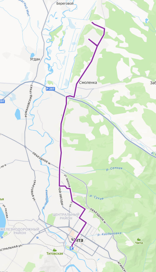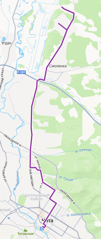 ЧИТА, Железнодорожный вокзал → пл. Ленина → Филармония → ул. Бабушкина → ул. Подгорбунского → Детский центр Орешки → Машзавод → Магазин Кедр → ул. Кочеткова → Госпиталь ветеранов → Диагностический центр → Краевая клиническая больница → Медицинский центр → Детская больница → ТЦ Макси → мкр. Северный → Троллейбусное депо → мкр. Царский → Управление МЧС → Геологическая → Каштак → по требованию → пр-д Дачный → мкр. Солнечный → Три тополя → Смоленское кольцо → Магазин Атриум → Воинская часть → Смоленка, ул. Новосельская → по требованию → мкр. Добротный → мкр. Добротный, поворот → мкр. БЛАГОДАТНЫЙ