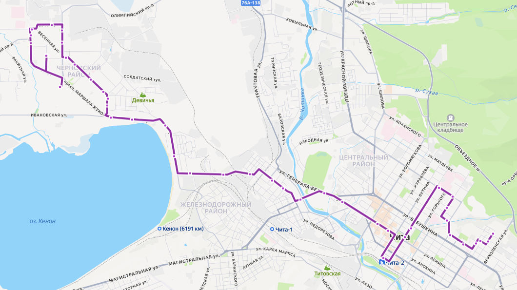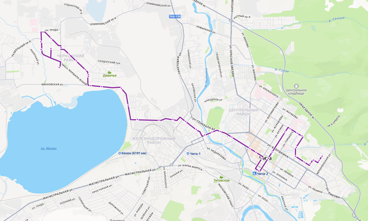 ОБЩЕЖИТИЕ ЗабГУ → Новозаводская улица → ЗабГУ → ЗабГК → ЦЗП Богатырь → Кинопрокат → Стоматологическая клиника → Стадион СибВО → Магазин Черемушка → Краевая детская клиническая больница → Смоленская улица → Сквер Целинников → Гостиница Забайкалье → Железнодорожный вокзал → площадь Ленина → ТЦ Палермо → Магазин Сувениры → Мостовая улица → Стадион Локомотив → Дворец спорта Мегаполис → ул. Недорезова → Татарская улица → Стоматологическая поликлиника → Авиационная улица → Мелькомбинат → Автобаза → Водная станция → ул. Рахова → Ивановская улица → Озеро Кенон → микрорайон Девичья Сопка → ТЦ Спутник → ГИБДД → Универсам → ТЦ Благодатный → Театр национальных культур → Весенняя улица → Минирынок → Аптека → ул. Текстильщиков, д. 13 → 9 микрорайон → МОЛОДЁЖНЫЙ микрорайон