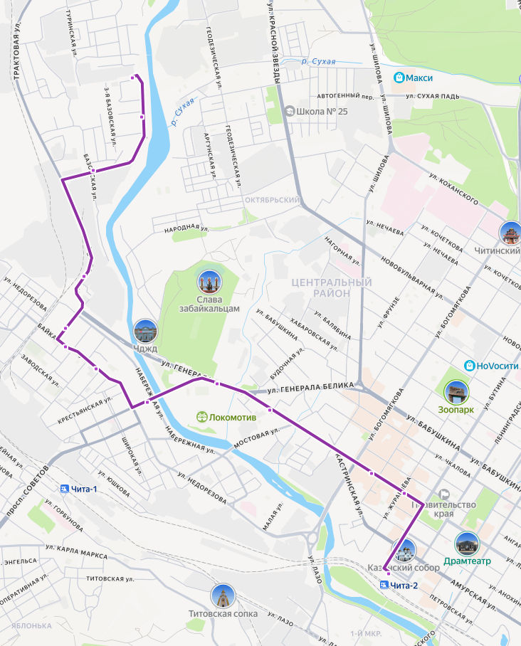 ЖЕЛЕЗНОДОРОЖНЫЙ ВОКЗАЛ → пл. Ленина → ТЦ Палермо → Магазин Сувениры → ул. Мостовая → Стадион Локомотив → Дворец спорта Мегаполис → ул. Недорезова → ул. Татарская → ул. Крымская → ул. Трактовая → ул. Базовская → мкр. Победа → ул. УСУГЛИНСКАЯ
