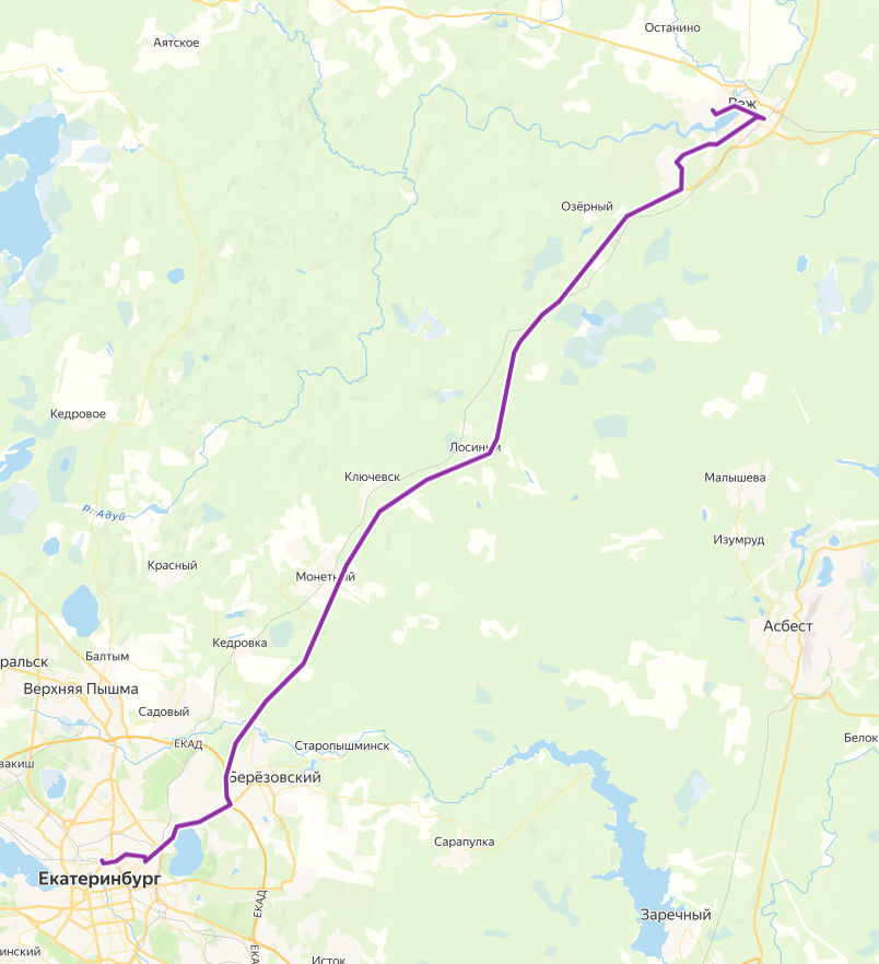 РЕЖ, СЭС → Библиотека → Набережная → РЕЖ, Автостанция → Привокзальная → ул. Павлика Морозова → пос. Быстринский → ДК Горизонт → ДК Горизонт → Стройгородок → Сады → поворот на Стриганово → поворот на Костоусово → поворот на Крутиху → 54 километр → Лосиный, ул. Соколова → Сады 85 → Сады Дары осени → поворот на Ключевск → 38 километр → Благодатный → Переезд → Долевое → 27 километр → Вышка → Река Мочаловка → Подсобное хозяйство → 19 километр → Северное кладбище → ул. Максима Горького → пос. Новоберезовский → поворот на Изоплит → ул. Рыбаков → Норильская улица → Проезжая улица → Дачная улица → ТК Современник → ЕКАТЕРИНБУРГ, Северный автовокзал