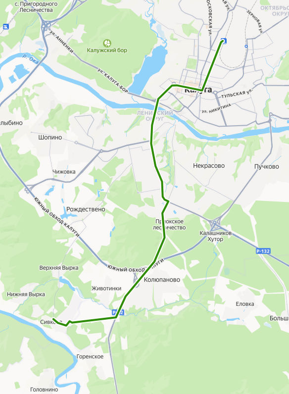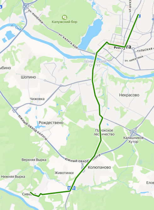 СИВКОВО, Ореховая улица → Животинки → поворот на Колюпаново → Лесничество → Секиотовская улица → Развилка → Секиотово → Шопинский поворот → Ромоданово → КФ МГТУ Баумана → СТАНЦИЯ КАЛУГА-1