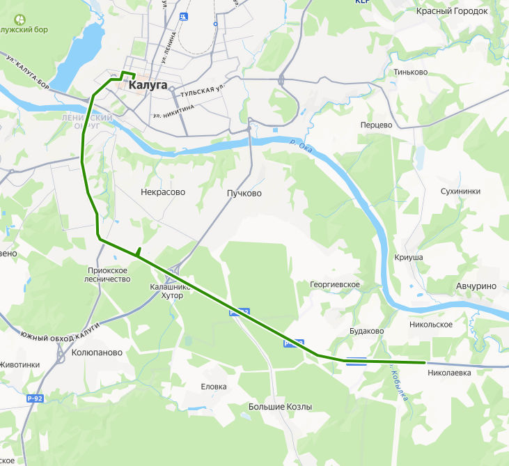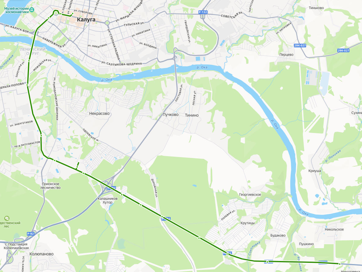 НИКОЛЬСКОЕ → Будаково → Крутицы → Лесная поляна → поворот на Большие Козлы → СНТ Лесовод-2 → СНТ Березка → Дачи → СПОРТПАРК КАЛУЖНИКИ → Развилка → Секиотово → Шопинский поворот → Ромоданово → КФ МГТУ Баумана → ТРК 21 век → СКВЕР МЕДИЦИНСКИХ СЕСТЕР