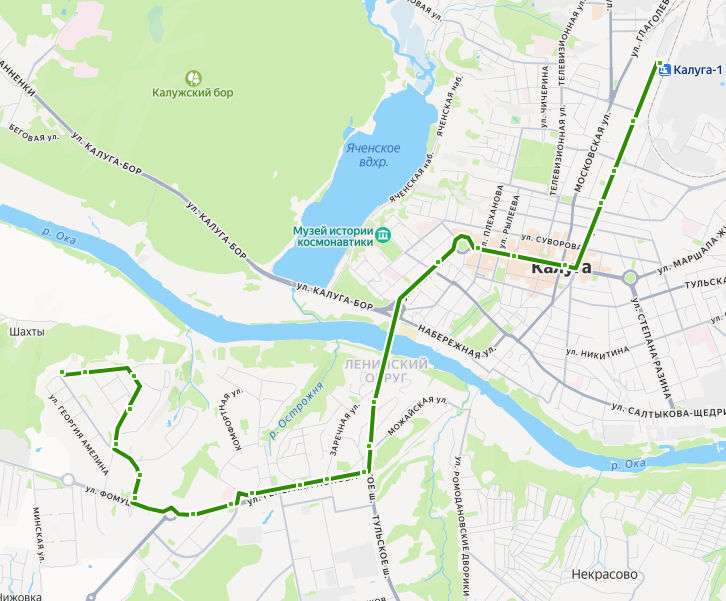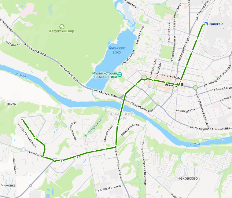 СТАНЦИЯ КАЛУГА-1 → Машзавод → Сквер Комсомола → Концертный зал → Кинотеатр Центральный → ТРЦ Рио → ТРК 21 век → КФ МГТУ Баумана → Ромоданово → ул. Можайская → Шопинский поворот → Школа искусств → Библиотека → ул. Генерала Попова → Правгород → Детская поликлиника → ул. Фомушина → ул. Павла Ягужинского, д. 4 → Верховая → ул. Андрея Алёшина → ул. Владимира Козлова → ул. Бориса Литвинчука → мкр. КОШЕЛЕВ