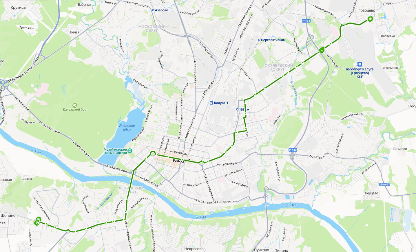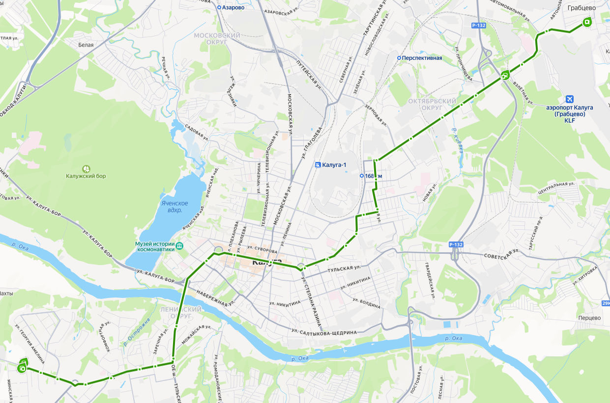 мкр. ВЕСНУШКИ → мкр. Кошелев → ул. Серафима Туликова → Детская поликлиника → Правгород → Библиотека → Школа искусств → Шопинский поворот → Ромоданово → КФ МГТУ Баумана → ул. Кирова → Кинотеатр Центральный → пл. Победы → Торговая база → Железнодорожная больница → Строительный техникум → пл. Маяковского → ул. Чапаева → Почта → ул. Моторная → Тайфун → Нефтебаза → Дубрава → Торговый центр → База → Воинская часть → Завод Фольксваген → ГРАБЦЕВО