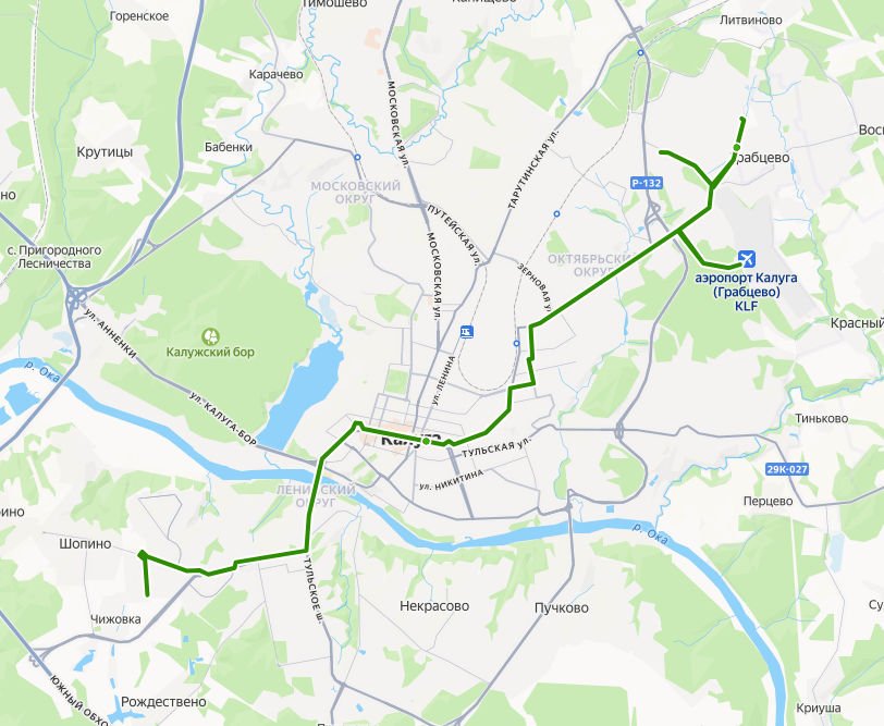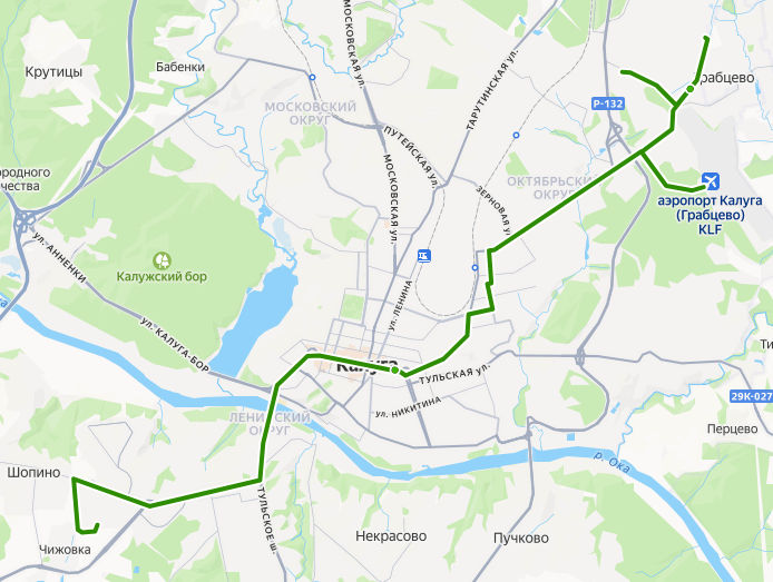 мкр. Веснушки, ул. МИНСКАЯ, д. 36 → Детский сад Карусель → мкр. Веснушки → мкр. Кошелев → ул. Серафима Туликова → Детская поликлиника → Правгород → Библиотека → Школа искусств → Шопинский поворот → Ромоданово → КФ МГТУ Баумана → ул. Кирова → Драмтеатр → Кинотеатр Центральный → пл. Победы → Торговая база → Железнодорожная больница → Строительный техникум → пл. Маяковского → ул. Чапаева → Почта → ул. Моторная → Тайфун → Нефтебаза → Дубрава → Торговый центр → База → поворот на аэропорт → АЭРОПОРТ → поворот на аэропорт → Воинская часть → Амбассадор → ул. Автомобильная → ОБЩЕЖИТИЯ ФУЯОСТЕКЛОРУС