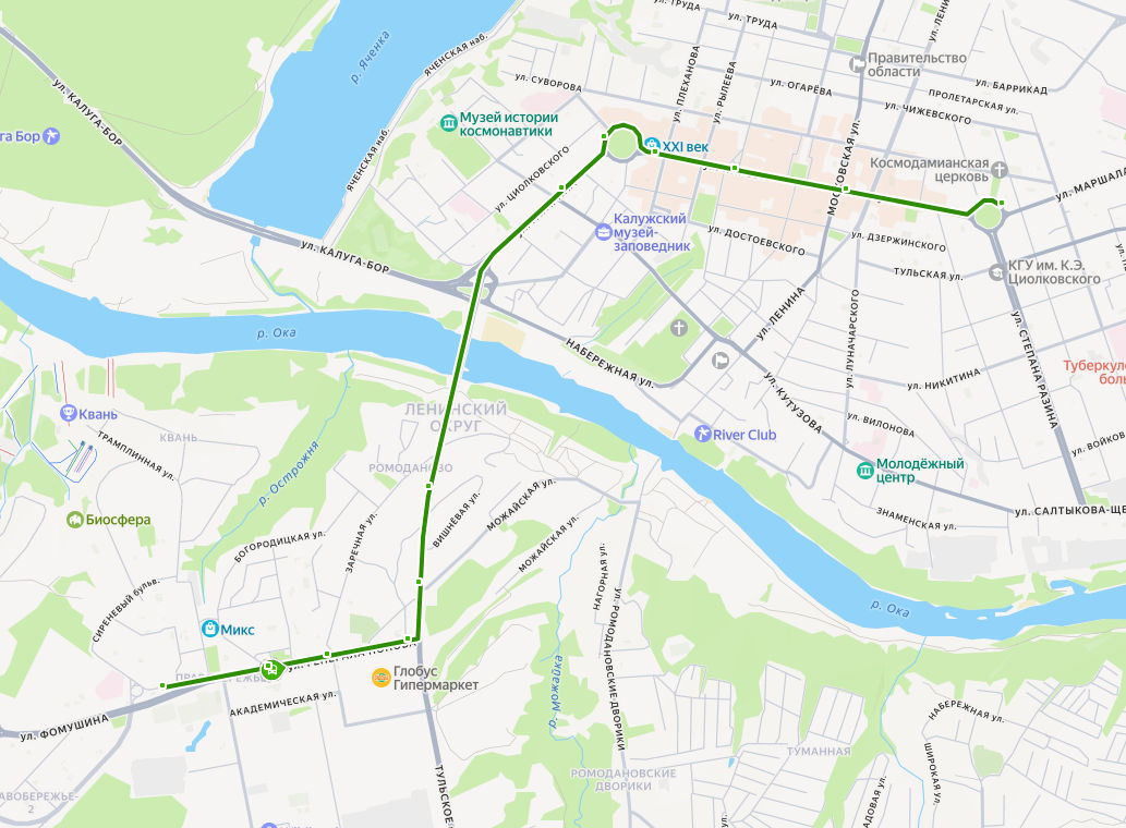 ул. ГЕНЕРАЛА ПОПОВА → Правгород → Библиотека → Школа искусств → Шопинский поворот → Ромоданово → КФ МГТУ Баумана → ул. Кирова → Драмтеатр → Кинотеатр Центральный → пл. ПОБЕДЫ