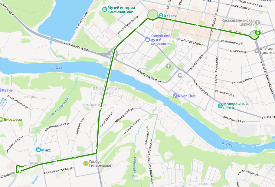 площадь ПОБЕДЫ → Кинотеатр Центральный → ТРЦ Рио → ТРК 21 век → Сквер Мира → КФ МГТУ Баумана → Ромоданово → Можайская улица → Шопинский поворот → Школа искусств → Библиотека → ул. ПОПОВА