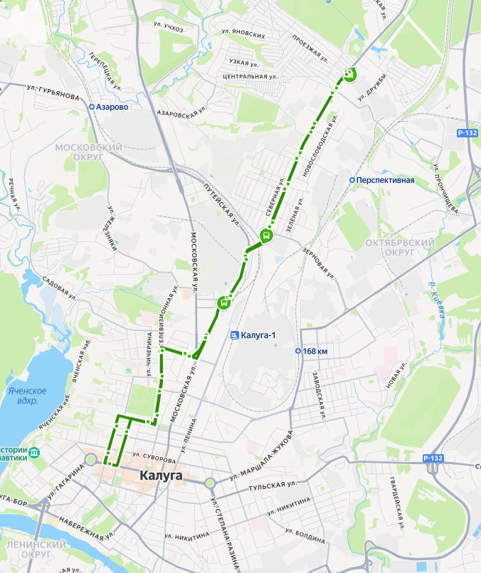 ул. КИРОВА → ТРК 21 век → ул. Пролетарская → ул. Телевизионная → ул. Пухова → ул. Билибина → пл. Московская → Спортивный комплекс Дельфин → ул. Бутома → Синие мосты → ул. Зерновая → Школа 25 → ул. Механизаторов → Обувная фабрика → Дворики → ул. ОЛЬГОВСКАЯ