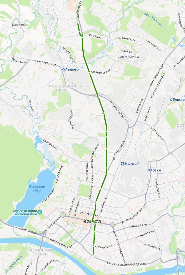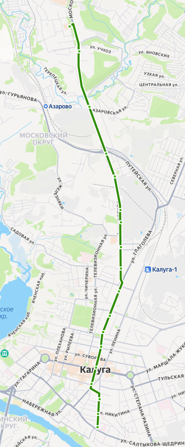 ШВЕЙНАЯ ФАБРИКА → ул. Никитина → Библиотека Белинского → Городская управа → Дом быта → ул. Огарева → Школа 14 → ул. Карла Либкнехта → пл. Московская → Магазин Спутник → Калужский турбинный завод → Троллейбусное депо → ГПТУ-6 → ул. Поселковая → Путепровод → ул. Азаровская → Лицей 13 → ул. КУБЯКА, 30 микрорайон