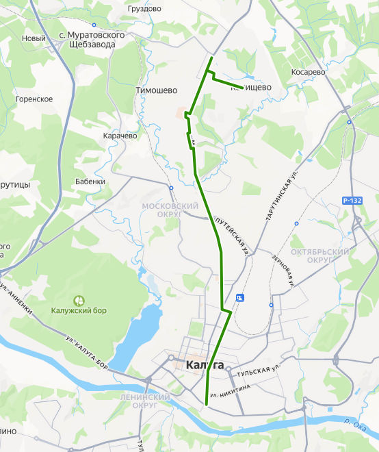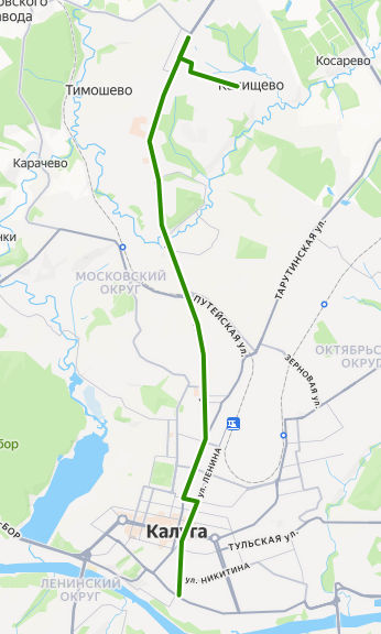 ШВЕЙНАЯ ФАБРИКА → ул. Никитина → Библиотека Белинского → Кинотеатр Центральный → Школа 14 → ул. Карла Либкнехта → пл. Московская → Магазин Спутник → Калужский турбинный завод → Троллейбусное депо → ГПТУ-6 → ул. Поселковая → Путепровод → ул. Азаровская → Лицей 13 → 30 микрорайон → ТРЦ Торговый квартал → мкр. Байконур → Дачная → Универмаг → пос. Северный → ул. Дорожная → Швейцарская деревня → КАНИЩЕВО, ул. Радостная