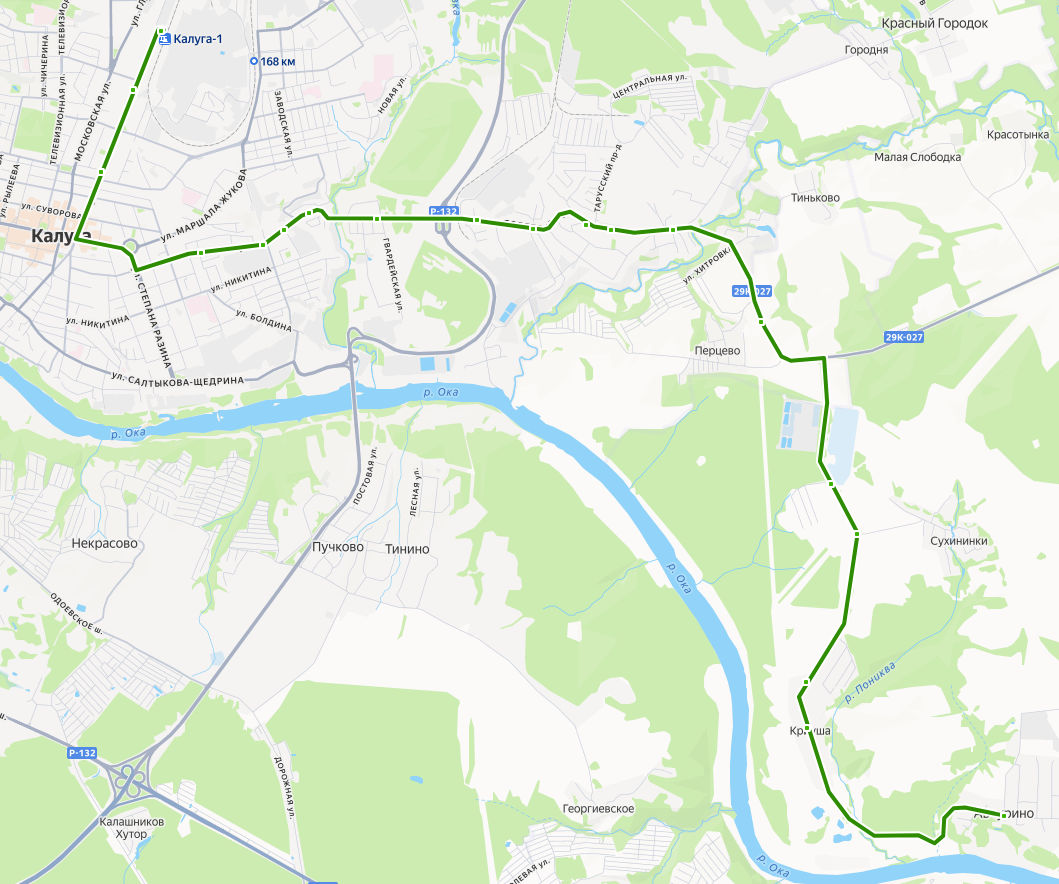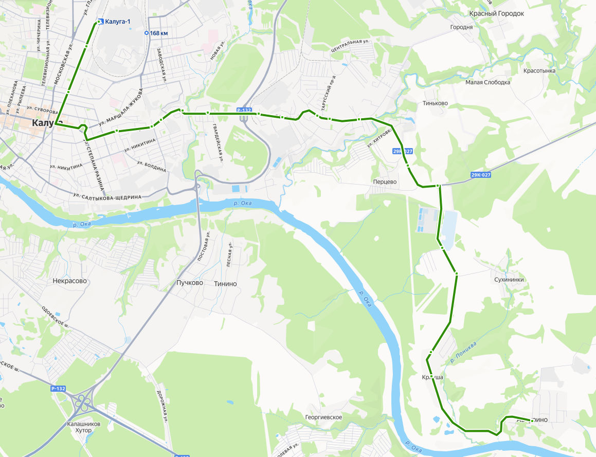 КАЛУГА, Автовокзал → Машзавод → Концертный зал → ул. Пестеля → Пожарное депо → Лесоторговая база → ул. Киёвка → пос. 40 лет Октября → Турынино, ост. 1 → Турынино, ост. 2 → Турынино, ост. 3 → Библиотека → ул. Просторная → Перцево → Сады Заря → Сухининки → Монолит → Криуша → АВЧУРИНО, Сельская администрация