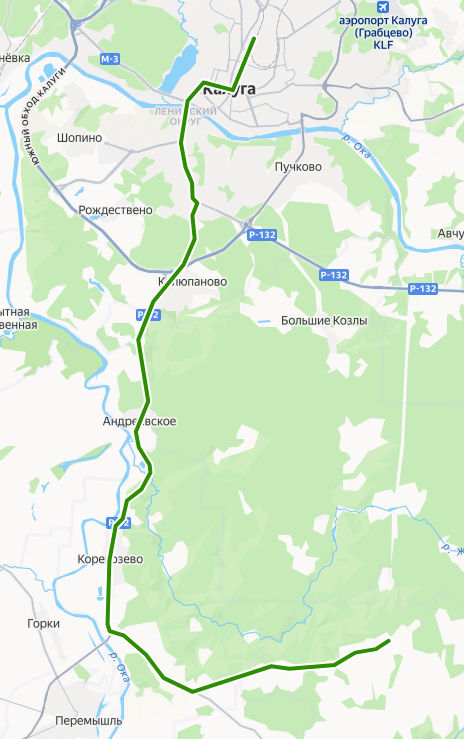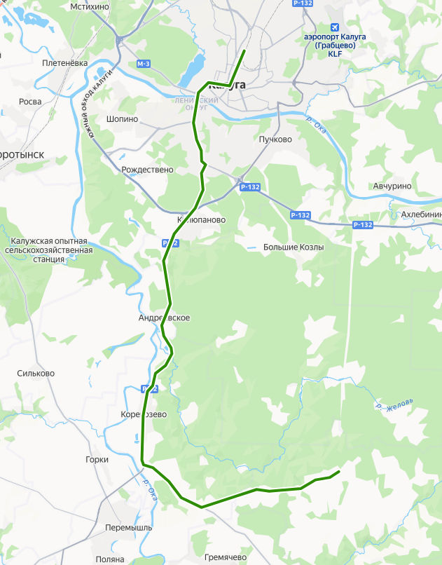 КОНСТАНТИНОВКА → Григоровское → Вечна, ост. 2 → Вечна, ост. 1 → Вольня → поворот на Мехово → Бушовка → Голодское → поворот на Голодское → Корекозево, ост. 5 → Корекозево, ост. 4 → Корекозево, ост. 3 → Корекозево, ост. 2 → Корекозево, ост. 1 → Юность → Андреевское → Горенское → Лагерь Звёздный → Вырка → Животинки → поворот на Колюпаново → Лесничество → Секиотовская улица → Развилка → Секиотово → Шопинский поворот → Ромоданово → КФ МГТУ Баумана → КАЛУГА, Станция Калуга-1