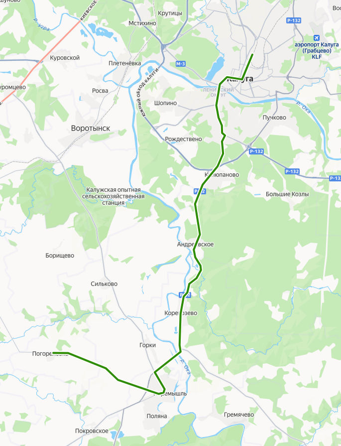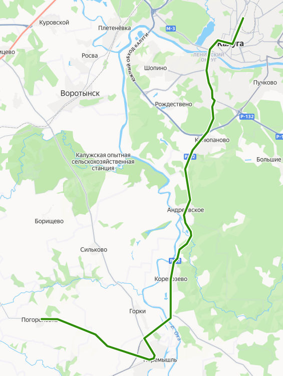 ПОГОРЕЛОВКА → Петровское → Прудищи → Рыченки → Жашково → Перемышль, Юбилейная улица → Перемышль, Автостанция → поворот на Перемышль → поворот на Голодское → Корекозево, ост. 5 → Корекозево, ост. 4 → Корекозево, ост. 3 → Корекозево, ост. 2 → Корекозево, ост. 1 → Юность → Андреевское → Горенское → Лагерь Звёздный → Вырка → Животинки → поворот на Колюпаново → Лесничество → Секиотовская улица → Развилка → Секиотово → Шопинский поворот → Ромоданово → КФ МГТУ Баумана → КАЛУГА, Станция Калуга-1