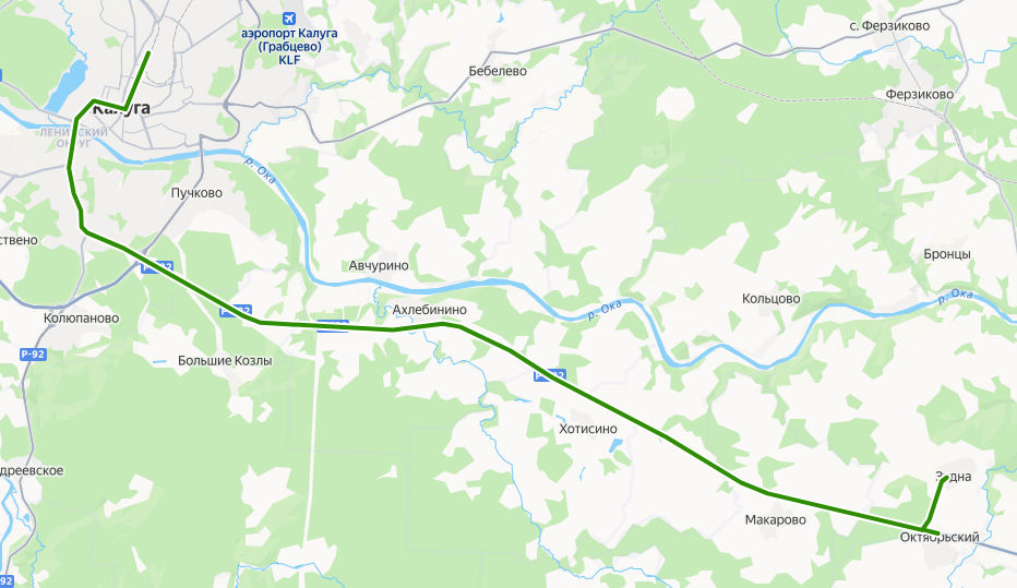 ЗУДНА, Садовая улица → поворот на Зудну → поворот на Октябрьский → Забелино → поворот на Макарово → Басово → Курово → Борисовка → Семёновка → поворот на Хотисино → Ломохино → Животноводческий комплекс → поворот на Ахлебинино → Средняя Фабрика → Никольское → Будаково → Крутицы → Лесная поляна → поворот на Большие Козлы → СНТ Лесовод-2 → СНТ Берёзка → Дачи → Развилка → Секиотово → Шопинский поворот → Ромоданово → КФ МГТУ Баумана → Кинотеатр Центральный → КАЛУГА, Станция Калуга-1