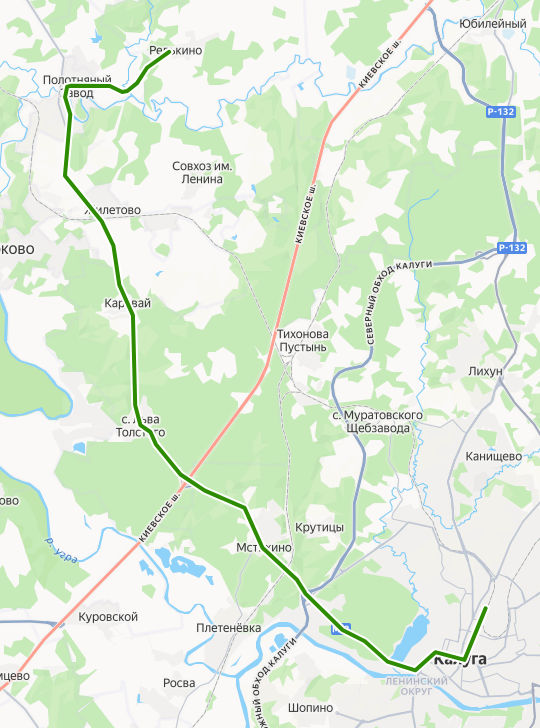 КАЛУГА, Автовокзал → Школа 6 → Санаторий Бор → Санаторий Павлика Морозова → Санаторий Сокол → Сельскохозяйственная выставка → Анненки → Сельскохозяйственная академия → Пионерский лагерь Орлёнок → Путепровод → поворот на Мстихино → Мстихино → Санаторий Строитель → село Льва Толстого → Комплекс МТФ → Каравай, ост. 1 → Каравай, ост. 2 → Сады Сосновый бор → Акатово → Жилетово → Полотняный завод → Полотняный завод, Дом культуры → Устье → Редькино, Школа → РЕДЬКИНО