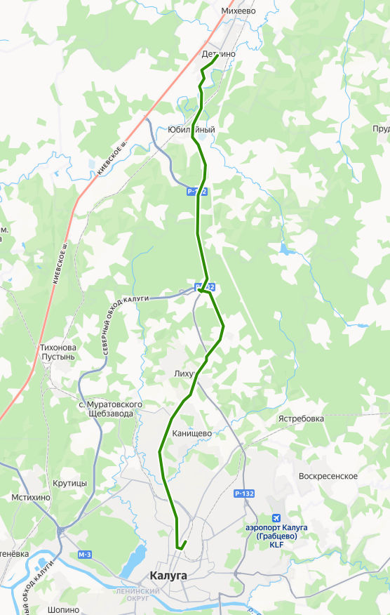 КАЛУГА, Автовокзал → ТРЦ Торговый квартал → пос. Северный → ул. Калужского ополчения → поворот на Доможирово → Дачи Тепличный → Дачи Заря → ул. 4 Благодатная → Дачи Василёк → Ильинка → поворот на Григоровку → дер. Ильинка → Жерело → Пнево → Юбилейный → Таурово → Детчино, ул. Ленина → ДЕТЧИНО, ул. Советская
