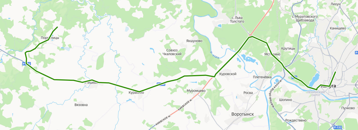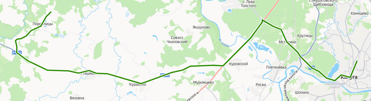 ВЫПОЛЗОВО → Порослица → Санаторий Павлищев Бор → Воронино → Лопухино → Утёшево, ост. 2 → Утёшево, ост. 1 → Волхонское → Куракино → Липилины Дворы → Чёрная Грязь → Сосновка → поворот на Семыкино → Куровское → АЗС Угра → Санаторий Строитель → Мстихино → поворот на Мстихино → Путепровод → Сельскохозяйственная академия → Сельскохозяйственная выставка → Санаторий Сокол → Санаторий Морозова → Санаторий Бор → КФ МГТУ Баумана → КАЛУГА, Станция Калуга-1
