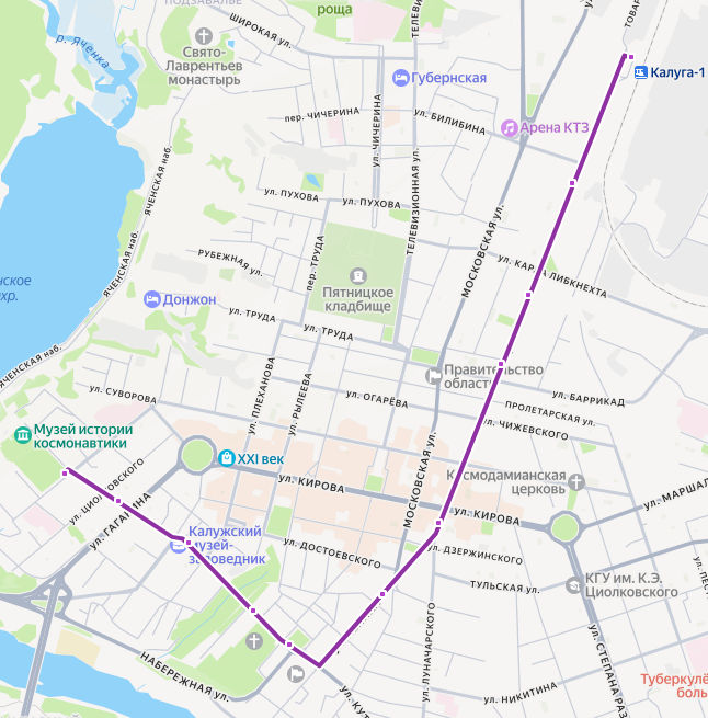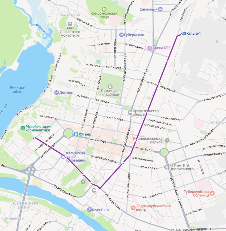 СТАНЦИЯ КАЛУГА-1 → Машзавод → Сквер Комсомола → Концертный зал → Кинотеатр Центральный → Городская управа → пл. Старый торг → Каменный мост → ул. Баумана → Школа 6 → ПАРК ЦИОЛКОВСКОГО