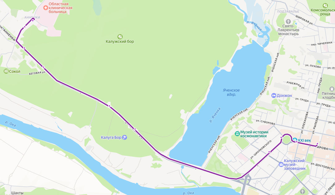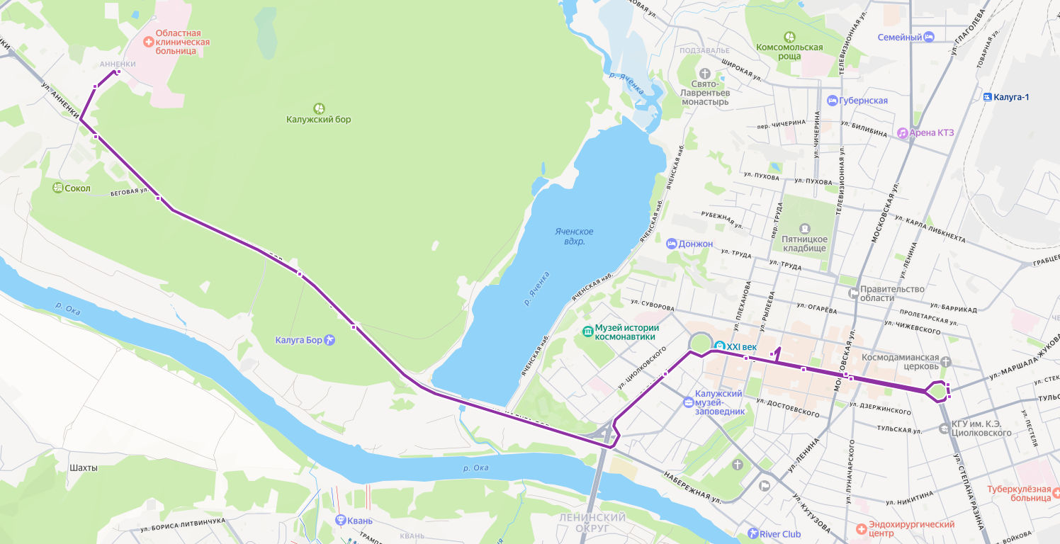 ОБЛАСТНАЯ БОЛЬНИЦА → ул. Вишневского → Сельскохозяйственная выставка → Санаторий Сокол → Санаторий Морозова → Санаторий Бор → КФ МГТУ Баумана → ул. Кирова → Драмтеатр → Кинотеатр Центральный → площадь Победы → площадь Победы → Кинотеатр Центральный → СКВЕР МЕДИЦИНСКИХ СЕСТЁР