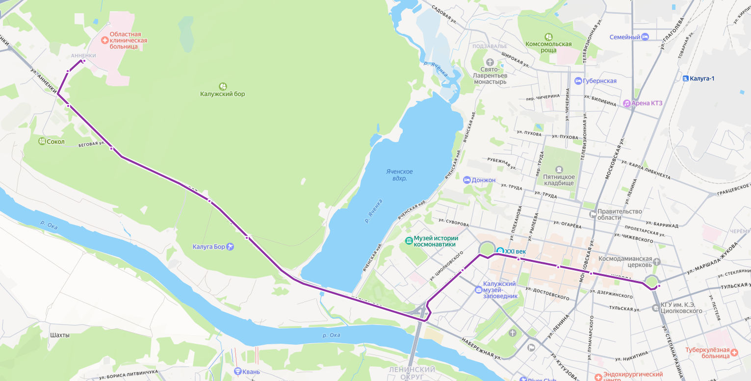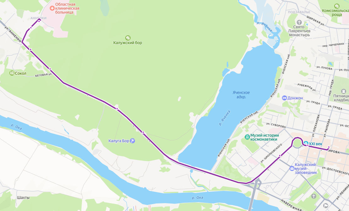 ОБЛАСТНАЯ БОЛЬНИЦА → ул. Вишневского → Сельскохозяйственная выставка → Санаторий Сокол → Санаторий Морозова → Санаторий Бор → КФ МГТУ Баумана → ул. Кирова → Драмтеатр → Кинотеатр Центральный → площадь ПОБЕДЫ