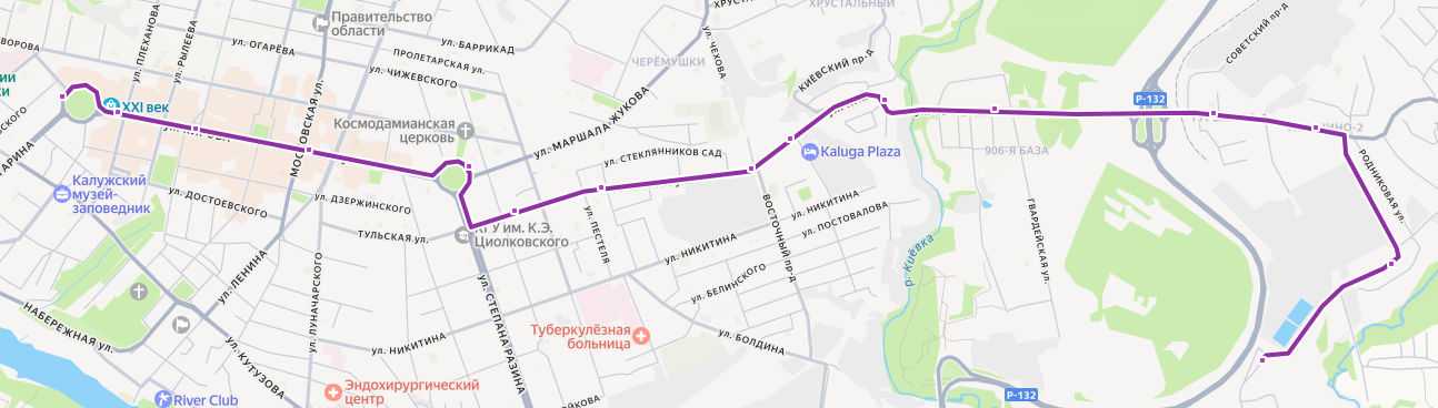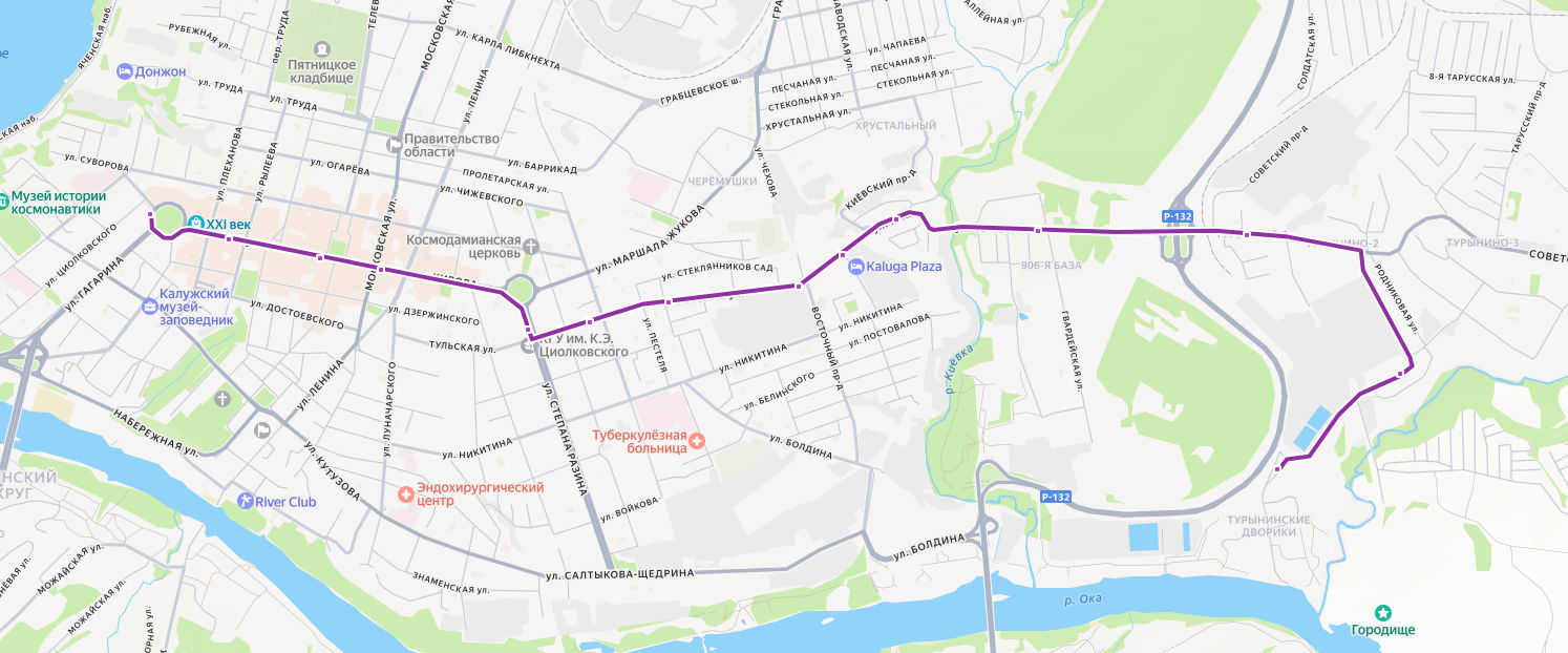 ТУРЫНИНСКИЕ ДВОРИКИ → ул. Родниковая → Турынино, ост. 2 → Турынино, ост. 1 → пос. 40 лет Октября → ул. Киёвка → Лесоторговая база → Пожарное депо → ул. Пестеля → ул. Фридриха Энгельса → пл. Победы → Кинотеатр Центральный → ТРЦ Рио → ТРК 21 век → СКВЕР МИРА