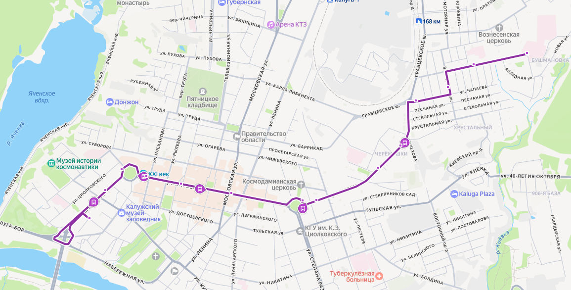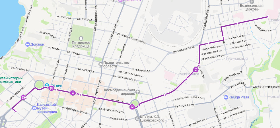 ул. КОСМОНАВТА КОМАРОВА → КФ МГТУ Баумана → ул. Кирова → Драмтеатр → Кинотеатр Центральный → пл. Победы → Торговая база → Железнодорожная больница → Строительный техникум → пл. Маяковского → ул. Чапаева → Дом престарелых → БУШМАНОВКА