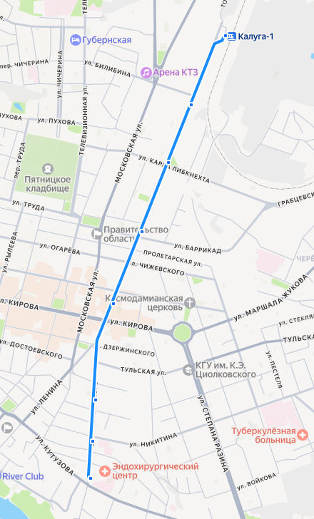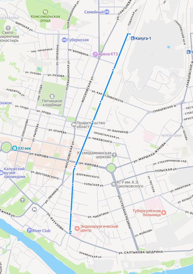 СТАНЦИЯ КАЛУГА-1 → Машзавод → Сквер Комсомола → Концертный зал → Кинотеатр Центральный → Библиотека Белинского → ул. Никитина → ШВЕЙНАЯ ФАБРИКА