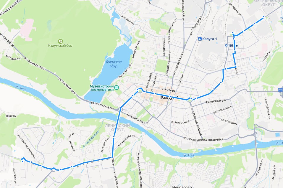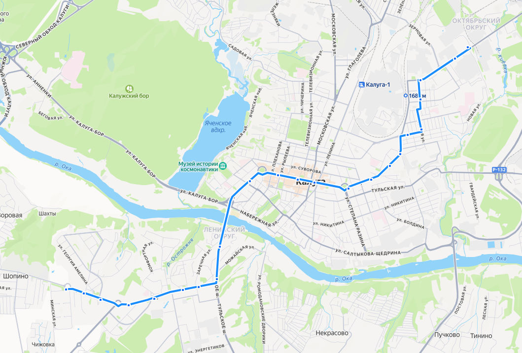 ДУБРАВА → Тайфун → ул. Зерновая → КРЛЗ → ул. Моторная → Почта → ул. Чапаева → пл. Маяковского → Строительный техникум → Железнодорожная больница → ул. Маршала Жукова → пл. Победы → Кинотеатр Центральный → ТРЦ Рио → ТРК 21 век → Сквер Мира → КФ МГТУ Баумана → Ромоданово → Шопинский поворот → Школа искусств → Библиотека → Правгород → Детская поликлиника → ул. Серафима Туликова → мкр. Кошелев → мкр. ВЕСНУШКИ