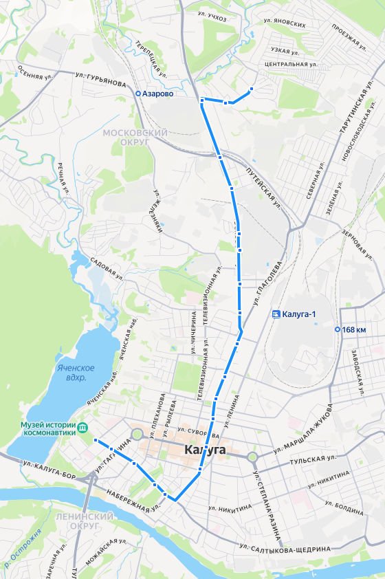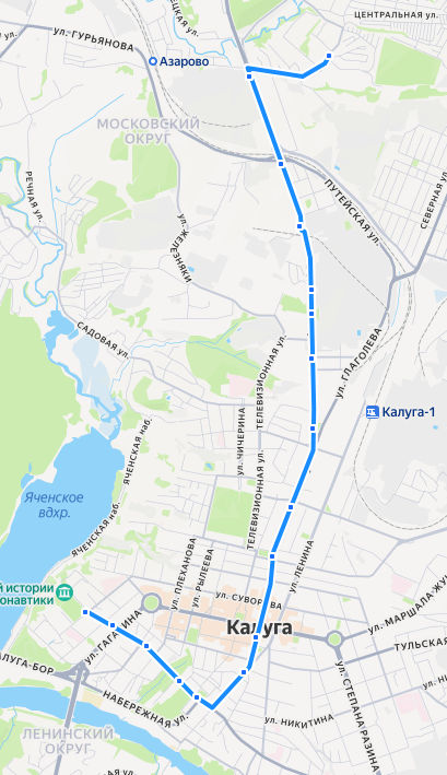 ТЕРЕПЕЦ → ул. Азаровская → Путепровод → ул. Поселковая → ГПТУ-6 → Троллейбусное депо → КАЛУЖСКИЙ ТУРБИННЫЙ ЗАВОД → пл. Московская → ул. Карла Либкнехта → Школа 14 → Дом быта → Городская управа → пл. Старый торг → Каменный мост → ул. Баумана → Школа 6 → ПАРК ЦИОЛКОВСКОГО
