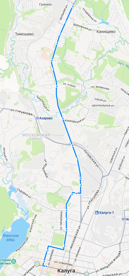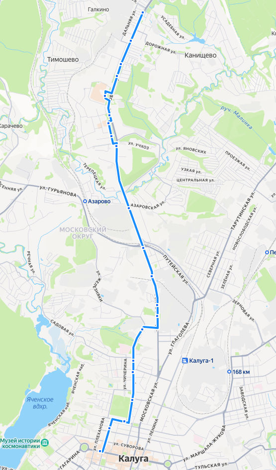 пос. СЕВЕРНЫЙ → Универмаг → Дачная → микрорайон Байконур → ТРЦ Торговый квартал → ул. Кибальчича → ул. Кубяка → Малоярославецкая улица → Лицей 13 → Азаровская улица → Путепровод → Поселковая улица → ГПТУ-6 → Троллейбусное депо → Сосновая роща → Школа 7 → ул. Билибина → ул. Пухова → Телевизионная улица → ул. Огарёва → ул. КИРОВА