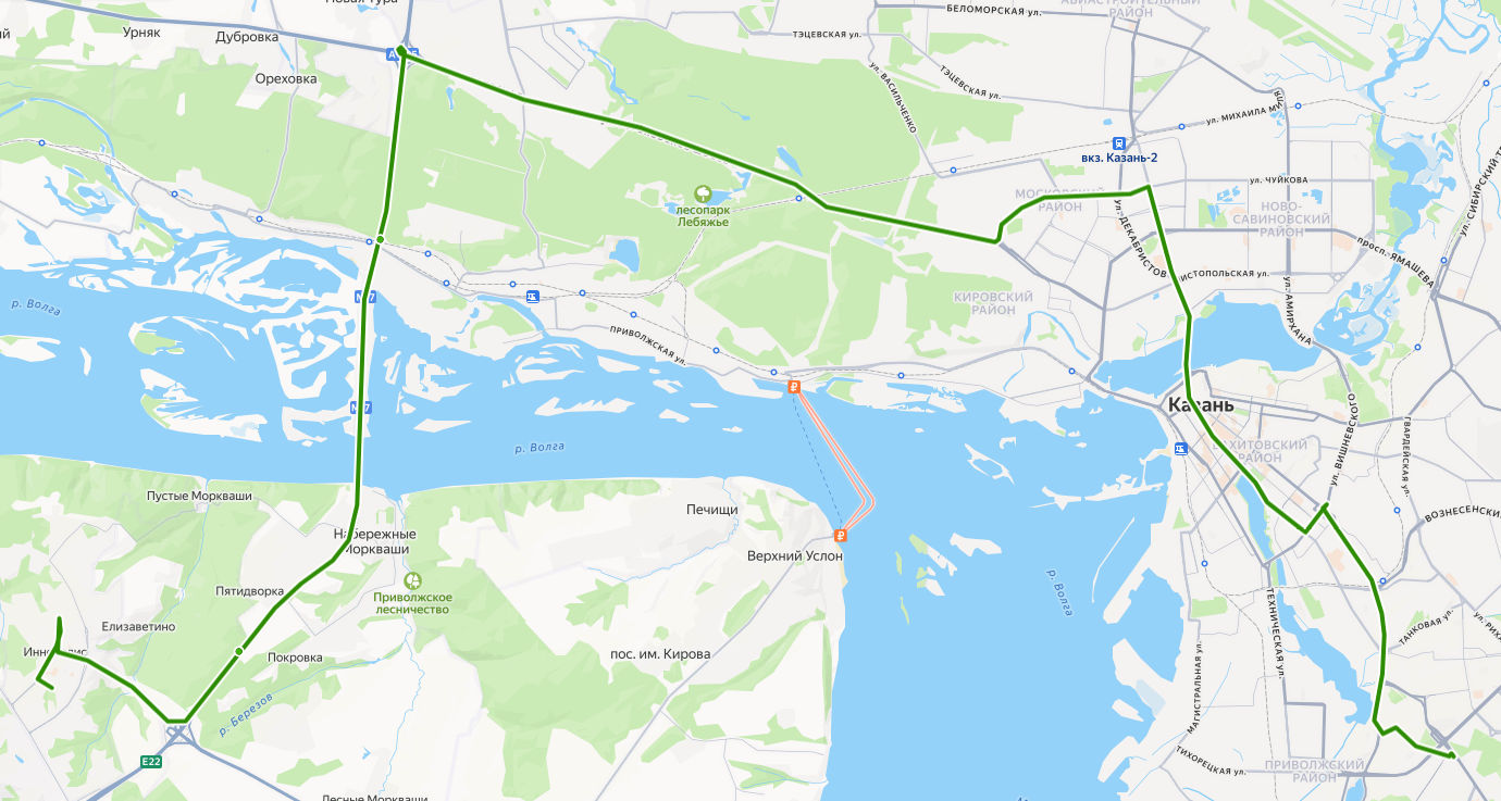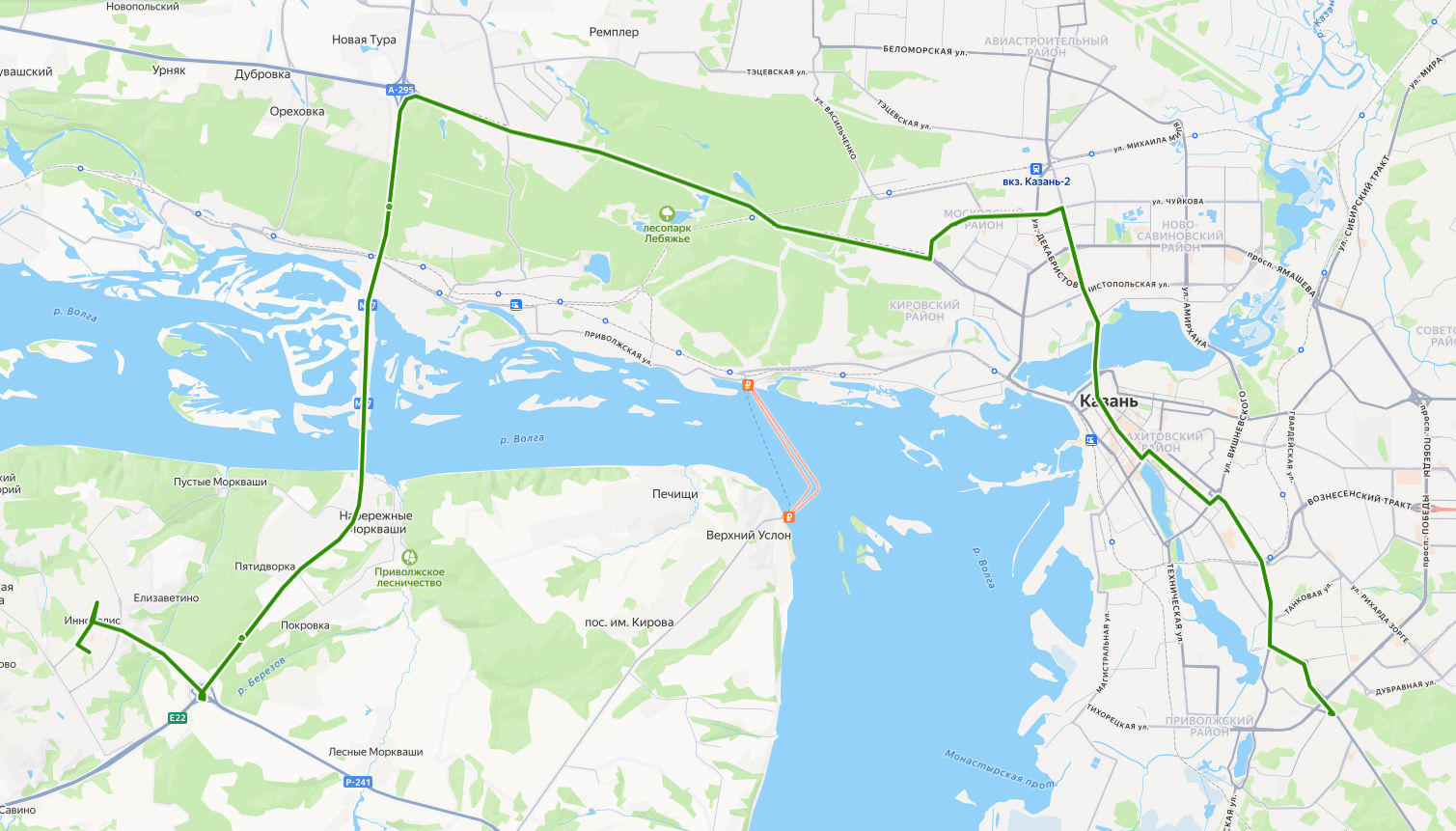 КАЗАНЬ, Автовокзал Южный → Метро Суконная Слобода → ул. Туфана Миннуллина → КОМБИНАТ ЗДОРОВЬЕ → ул. Чернышевского → Энергетический университет → Гуманитарный институт → ул. Волгоградская → ул. Восстания → р-д Восстания → ш. Горьковское → СК Олимпиец → ЖМ Залесный → Набережные Моркваши → Технопарк Попова → Медицинский центр → Университет Иннополис → ул. Спортивная → ИННОПОЛИС, ул. Парковая