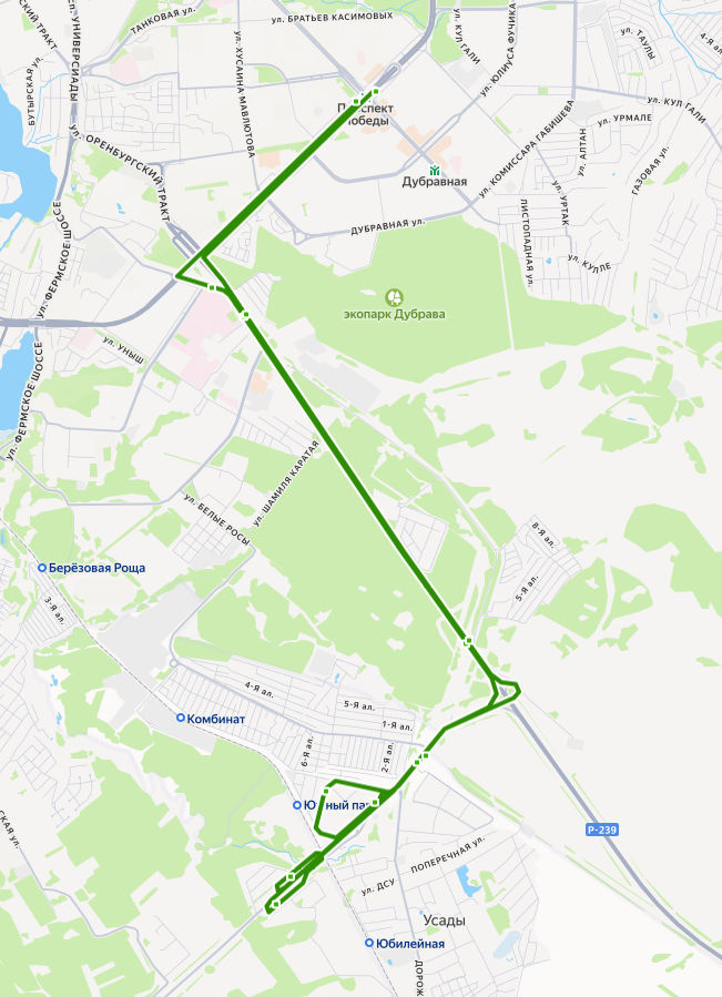 ЖК ЮЖНЫЙ ПАРК → ЖК Времена года → ЖК Станция Спортивная → Жиркомбинат → СНТ Ромашка → Общежития РКБ → КАЗАНЬ, Метро Проспект Победы