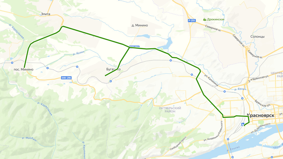 КРАСНОЯРСК, Комбайновый завод → ул. Робеспьера → ГорДК → Кинотеатр Строитель → Озеро-парк → Бугачево → по требованию → Минино → пос. ГЕОЛОГОВ