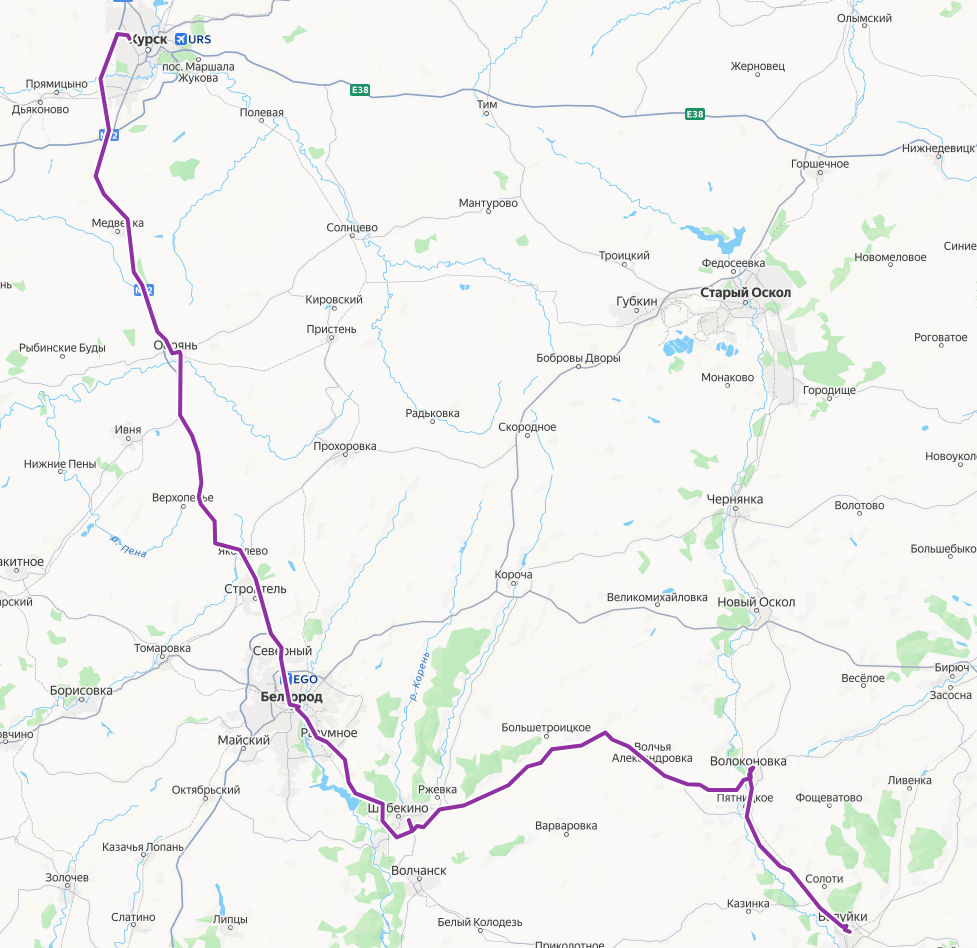 КУРСК, Автовокзал → Школа 47 → Селиховы Дворы → Госзаповедник → поворот на Панино → Николаевка → Черниченские Дворы → Высоконские Дворы → Красная Новь → Соломыковские Дворы → поворот на Рождественское → поворот на Медвенку → поворот на Паники → поворот на Танеевку → поворот на Монастырский → поворот на Драчёвку → Дрозды → поворот на Котельниково → поворот на Знаменку → Обоянь, Ресторан Айсберг → Обоянь, Автостанция → Пригородный → поворот на Афанасьево → поворот на Ивню → Зоринские Дворы → поворот на Владимировку → поворот на Кочетовку → Новосёловка → поворот на Сухосолотино → поворот на Покровский → поворот на Верхопенье → Красная Дубрава → поворот на Сырцево → Курская Дуга → поворот на Покровку → Погореловка → Ковалёвка → Яковлево → Крапивенские Дворы → поворот на Строитель → Белгород, Автовокзал → Белгород, АВ → Белгород, Железнодорожный вокзал → Дачи → поворот на Крутой Лог → Железнодорожный переезд → Ржавец → поворот на Графовку → Птицефабрика → Титовка → Шебекино, Автовокзал → Вознесеновка → АБЗ → Щигровка → х. Быковский → Маломихайловка → Нижнее Берёзово → Старовщина → Козьмодемьяновка → поворот на Терновое → Белянка, ост. 1 → Белянка, ост. 2 → Сурково → 1-е Цепляево → Червона Дибровка, ост. 1 → Червона Дибровка, ост. 2 → Максимовка, ост. 1 → Максимовка, ост. 2 → Максимовка, ост. 3 → Шемраевка → Крепацкий → Бершаково, ост. 1 → Бершаково, ост. 2 → Бершаково, ост. 3 → Александровка → поворот на Сиротин → Первомайский → Волчья Александровка → Новодевичий → Малиново → Красный Пахарь → по требованию → Верхние Лубянки → Евдокимов → Нижние Лубянки → Волоконовка, Самолёт → Косарь → Церковь → Волоконовка, Автостанция → Волоконовка, ЦРБ → Пятницкое, МКК → поворот на Козловку → поворот на Ульяновку → Ветчининово → поворот на Владимировку → Овчинниково → поворот на Принцевку → Станция Принцевка → поворот на Хохлово → Агеев Сад → поворот на Солоти → Валуйки, Гостиница Центральная → ВАЛУЙКИ, Автовокзал