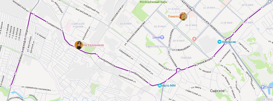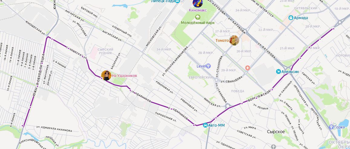ЛИПЕЦК, Автовокзал → ул. Будённого → Памятник Танкистам → ул. 8 Марта → Сырская школа → ул. Ленина → ш. Воронежское → ДРСУ → ПОГА-1 → Школа 23 → Сырский Рудник → Переезд → ул. Юношеская → Межколхозстрой → Сады Спутник → Сады Окружной дороги → Берендей → САДЫ ГОРНЯК