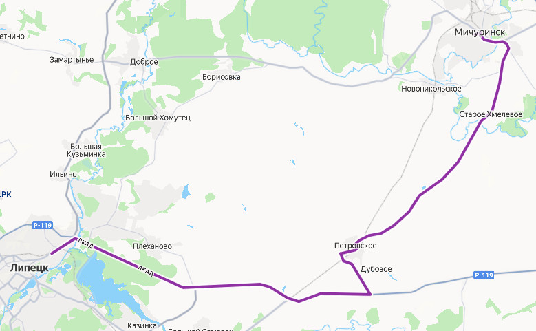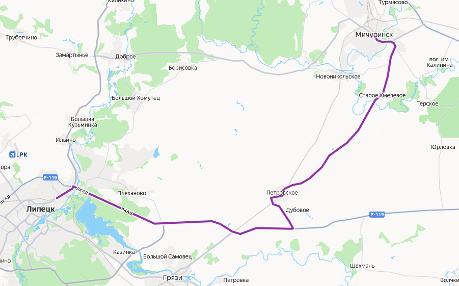 ЛИПЕЦК, Автостанция Сокол → Пионерские лагеря → поворот на Малей → Тройное → Кочетовка → Станция Песковатка → поворот на Песковатку → поворот на Крутое → поворот на Петровское → Добровольский → Петровское, Парк Патриот → Петровское, Автостанция → Почта → Петровское, ул. Садовая → поворот на Покрово-Чичерино → Малый Избердей → поворот на Чёгловку → Чибизовка → Кугушево → Новое Хмелевое → Старое Хмелевое, Магазин → Старое Хмелевое → Старое Хмелевое, ул. Пасека → поворот на Борщевое → Заворонежское, ул. Заречная → ЦРБ → Второй перекрёсток → Первый перекрёсток → Школа → Магазин → Заворонежское, Сельпо → Мичуринск, Спиртзавод → Пятая Чайная → Боголюбский собор → ул. Гоголевская → пл. Славы → МИЧУРИНСК, Автостанция