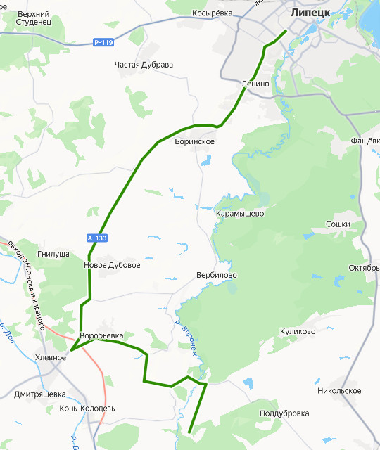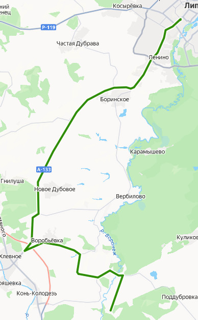 ИЗЛЕГОЩЕ, ул. Хутора → Центральная улица → Излегоще, ул. Большак → САВИЦКОЕ → Подгорное → Ворон-Лозовка, Церковь → Ворон-Лозовка → Воробьёвка, Садовая улица → Воробьёвка, Дорожная улица → Воробьёвка, Молодёжная улица → поворот на Воробьёвку → Елецкая Лозовка, ост. 1 → Елецкая Лозовка, ост. 2 → поворот на Новое Дубовое → Никольское → Долгая → Черёмушки → поворот на Стебаево → Подстанция → поворот на Троицкое → Пост ДПС → Памятник Танкистам → ЛИПЕЦК, Автовокзал