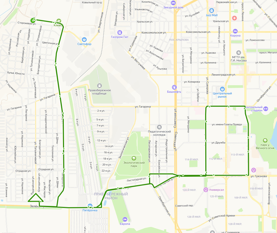 пос. ЗАПАДНЫЙ-1, ул. Пресная плотина → ул. Сторожевая, д.13 → ул. Цветочная → ул. Вишневая → ш. Западное, д.98 → ул. Усадебная → пос. Зеленая Долина → ул. Отрадная → пос. Нежный → СНТ Дружба → ул. Зеленая, д.10 → ул. Советская → Магазин Южный → ул. Дружбы → Парк Трех поколений → Детская больница → ул. Гагарина → ДРАМТЕАТР