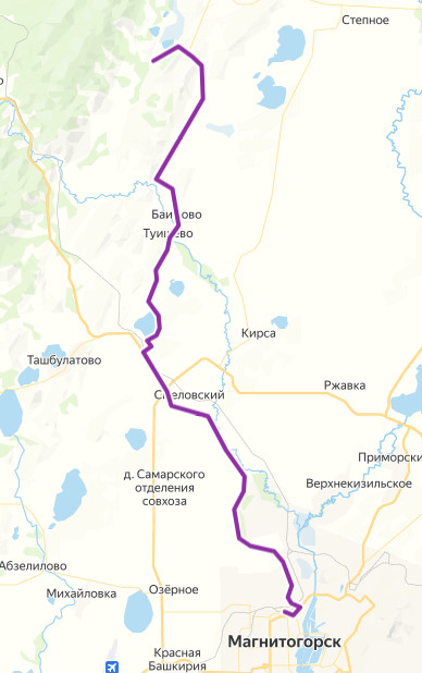 Аслаево → Баимово → Магнитогорск ≈ 63,6 км