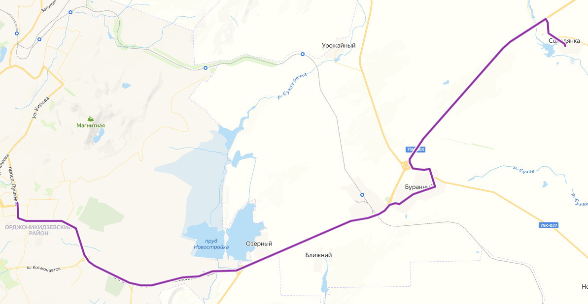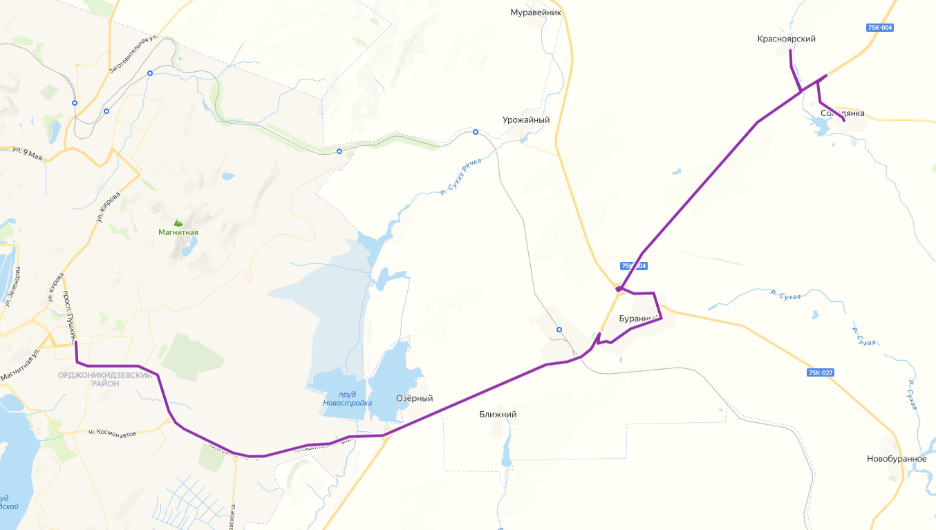 СОЛОДЯНКА, Сиреневый переулок → поворот на Красноярский и Солодянку → Красноярский → Буранный, ост. 2 → Буранный, ост. 1 → Станция Буранная → Элеватор → Ближний → Озерный → Южное кладбище → поворот на Поля орошения → пос. Самстрой → ул. Островского → Горбольница 1 → Полевая улица → ул. Фрунзе → ул. Чайковского → МАГНИТОГОРСК, площадь Победы